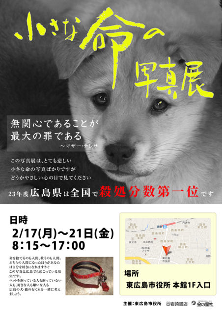 今回、私が初めてお手伝いで小さな命の写真展を開催する事になりました! 主催は、東広島市役所 こちらの担当者の方が、とっても愛護に理解のある方で 話がとんとん拍子に進み、開催となりました。 こちらの写真展の他、ボロボロからキラキラ という写真や 飼い主募集のポスターも掲示されます。 ぜひ、見に来てください。