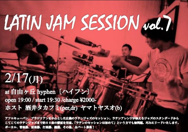 参加型ラテンジャムセッションのご案内です! ビギナーからプロの方まで参加頂き、毎回大変賑わっています。皆様のご参加をお待ちしています! 2月17日(月) LATIN JAM SESSION vol.7 @自由ヶ丘 hyphen〔ハイフン〕 open 19:00 / session 19:30〜 charge ¥2000-(drink別) 見学者は¥1000-(drink別) host 酒井タカフミ(per,dr) ヤマトヤスオ(b) information アフロキューバン、ブラジリアンを中心とした広義のラテンジャズのセッション。 ラテンアレンジが映えるジャズのスタンダードからこてこてのラテンジャズまで約80曲の譜面