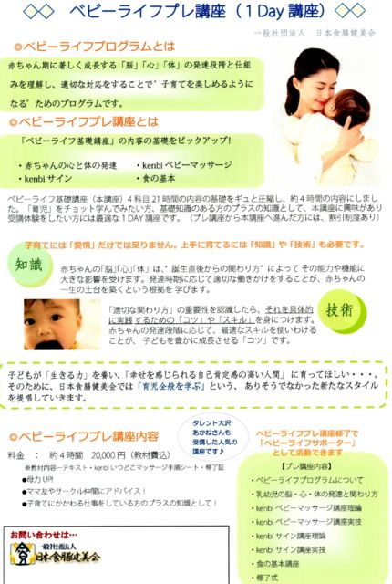 管理人様 いつも貴重な場にお知らせをさせていただきありがとうございます。 【託児有り・お子様同伴可能】<ベビーライフプレ講座 2月開講のお知らせ> 健康・子育て支援・生涯学習サークル「W-project」では、 一般社団法人日本食膳健美会札幌西スクールとして、 様々なプログラムを提供しております。 この度、一日、または半日×2で、 ご自分の育児はもとより、親子に関わるお仕事をされている方に お役立ていただける知識取得講座を開催いたします。 ご受講いただいた皆様に無試験で「ベビーライフサポータ