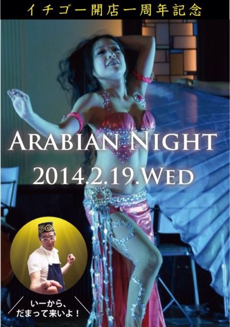 早いもので、愛すべきお店イチゴーが一周年を迎えます! そこで、きたる2/19(水)にイチゴー1st Anniversaryイベントが開催されます☆ 催しは地元、神田のスタジオからベリーダンスのインストラクターを迎えての本格ベリーダンスショー(なぜ?) ちなみにチャージや参加費はありません。 いつも通りフード、ドリンクともに\200でとのことです ま、マスターが決めてノリノリなので乗っかって楽しみましょう^^ なお画像は店内所狭しと貼られているキンコーズで出力したポスターです♪ お時間ある方はぜひお越しくださいませ☆
