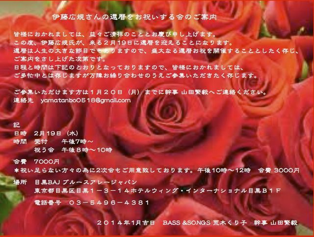 広規セッション大阪に参加していただいた方にご案内です 2/19日に広規さんが還暦を迎えられます。 大阪からはちょっと遠いのですが、皆さんふるってご参加ください これをみておられる方で参加ご希望の方は曄道(うめちよ)まで連絡ください 以下転載 明けましておめでとうございます。 今年もよろしくお願いします。 広規さんが今年還暦を迎えることになり、 本人は、111歳まで生きると申しており(笑) であるならば、第二の人生は50年もありかと、、、 そんなわけで還暦の会を盛大にしようとのことになり、お誘い申し上げます。 ぜ