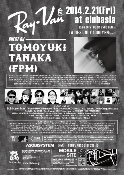 管理人さま告知失礼致します。 Ray-Van 2014-2-21(Fri) OPEN 23:00 @渋谷clubasia DOOR 3500yen(1d) / 女性限定!! 1000yen(別途1D) 男性の方はディスカウント枠もございますのでお気軽にmixiかTwitterにてメッセージください。 https://mobile.twitter.com/YASUKI_MORIOKA ■GENRE ALL DANCE MUSIC!! ■GUEST: Tomoyuki Tanaka(FPM) ■FLOOR LINE UP: 副島ショーゴ(T.U.S.) / Fumihiko Chiba(SixMAN) / SAKURAI MAKOTO(Dragon Ash) / Takeru John Otoguro(block.fm) / YASUKI / DJ UNNO / Nao Ogura / YOSSY(As