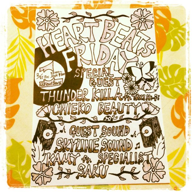 【HEART BEATS FRIDAY】 2/21(fri) 23:00〜 @調布Heart Beats ADM:\500 -SPECIAL GUEST- THUNDER KILLA fr.TAXI Hi-Fi CHIEKO BEAUTY -GUEST SOUND- SKYLINE SOUND KAMY fr.SPECIALIST SARU