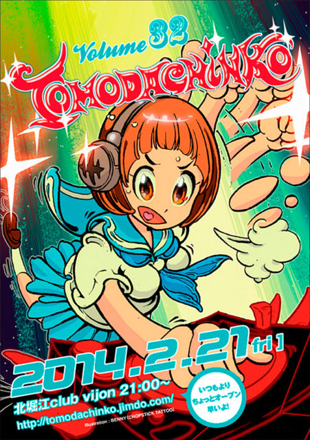 2014年2月21日(金曜日)@北堀江club vijon 「 TOMODACHINKO Vol.32 」 OPEN/START 21:00 ADV/DOOR ¥1,000 別途Drink代¥500 < 更衣室あり > ウェブサイト http://tomodachinko.jimdo.com/ mixiコミュニティ http://mixi.jp/view_community.pl?id=5541059 < LIVE > ・アレキシ藤原 ・ハヤリヤマイ ・いくらちゃん ・普段はなんでもOKを出す桝谷さんが「偽モナー」ってバンド名にはNGをだした。 ・magi!?cal★乙 < DJ > ・E-ROGic ・RAM(ヲタ霊/エーネーション@Anime Nation/VISUALきこうぜ/ゴロピカドン) ・wenZZ