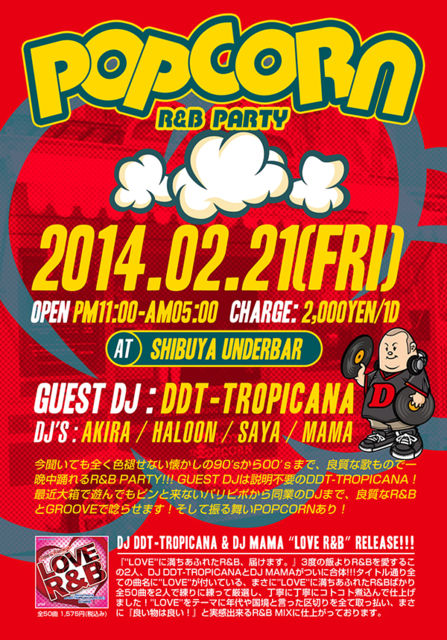 管理人様 告知失礼します。 本日!!! 渋谷UNDERBARにてR&B DJ PARTY! ◆POPCORN◆ 【R&B PARTY】 2014.02.21(Fri) @Shibuya UNDERBAR OPEN:PM11:00-AM05:00 CHARGE:¥2,000/1d ☆TOMIのゲストで“キャラメル”でディスカウント¥1,500/1dで入れます! お誘い合わせの上是非! -Guest DJ- DDT-TROPICANA -DJ's- MAMA AKIRA HALOON MAA @Shibuya UNDERBAR http://www.underbar.jp/map.html 今聞いても全く色褪せない懐かしのUK,USの90'sから00’sまで、良質な歌もので一晩中踊れるR&B PARTY!Gues