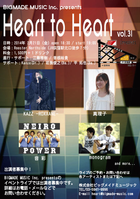 先日は、今年初めてのイベントも無事終了し、 今年も様々な出演者が音楽を通じて、 多くの発信をするスタートが切れました。 2月も、初めて出演するアーティストが多く、 いろいろなパフォーマンスが発信されます。 ぜひ、お時間あればお越しください! ------------------------------------- BIGMADE MUSIC Inc. presents 「Heart to Heart」vol.31 日時:2014年2月21日(金)open18:30 / start19:00 場所:Rooster Northside(JR荻窪駅北口徒歩7分) http://www.ogikubo-rooster.com/north/ 料金:1,500円+ドリンク 進行