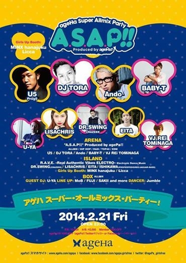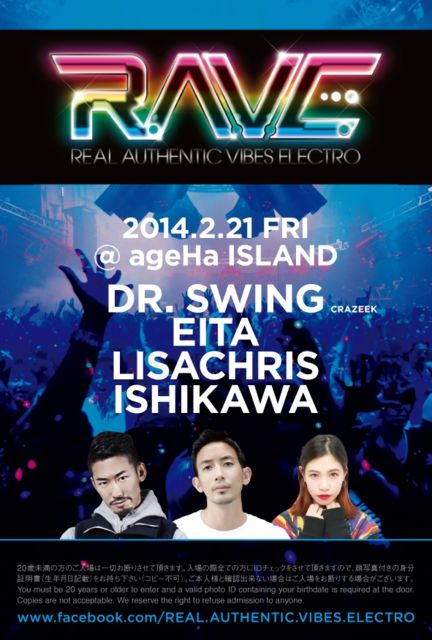 ¤¤¤è¤¤¤èÌÀÆü2/21¶âÍˤËÇ÷¤Ã¤¿¥Ö¥é¥ó¥Ë¥å¡¼¥Ñ¡¼¥Æ¥£¡¼¡¢ R.A.V.E. -Real Authentic Vibes Electro- ÆüËܺÇÂç¤Î¥¯¥é¥Ö¡¢ageHa @ STUDIO COAST¤ÎISLAND¥Õ¥í¥¢¤Ë¤Æ¶ö¿ô·îÂè»°¶âÍˤ˳«ºÅ¤Î Electronic Dance Music = EDM¤Î¥Ñ¡¼¥Æ¥£¡¼¤Ç¤¹¡£ ¢¢TITLE R.A.V.E. -REAL AUTHENTIC VIBES ELECTRO- ¢¢GENRE Electronic Dance Music ¢£LINE UP DR.SWING(CRAZEEK) LISACHRIS EITA ISHIKAWA(PROPERPEDIGREE/JAGUAR-BASS) REAL AUTHENTIC VIBES ELECTRO =¡ØÀµ¿¿ÀµÌäÎELECTRO¥ô¥¡¥¤¥Ö¥¹¡Ù¤È̾ÉÕ¤±¤é¤ì¤¿¤³¤Î¥¨¥¥µ¥¤¥Æ¥£¥ó¥°¤ÊÌë¤ò±é½Ð