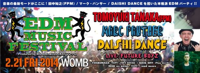 ¡ã¥¤¥Ù¥ó¥È¹ðÃΡ亣½µ¶âÍËÆü ¡ª2014,02,21(FRI)¤Ë³«ºÅ¤·¤Þ¤¹¡ª ¤´¶½Ì£¤¬¤¢¤ë¡¦»²²Ã¤µ¤ì¤¿¤¤¤ªµÒÍͤÏľÀÜ¡¢MA-SA°¸¤Ë¥á¥Ã¥»¡¼¥¸¤ò¤¯¤À¤µ¤¤¡£¾ÜºÙ¤´°ÆÆâ¤µ¤»¤Æ¤¤¤¿¤À¤¤Þ¤¹¡£ ¡ã³µÍ×¡ä ¢£¥Ñ¡¼¥Æ¥£Ì¾¡§EDMMUSICFESTIVAL ¢£Æü»þ¡§2014,02,21¡ÊFRI¡Ë23¡§00¡Á ¢£GUEST¡§DAISHIDANCE,FPM,MARCPANTHER ¢£DOOR: \3500 W/F&MEMBER: \3000 ¢£¾ì½ê¡§WOMB http://www.womb.co.jp/#!/womb/map.html 2014ǯ¡¢¤Ä¤¤¤ËÆüËܤǤâ EDM ¥à¡¼¥ô¥á¥ó¥È¤ÎͽÃû¥¢¥ê! WOMB ¤òÉñÂæ¤Ë¡¢ËܳÊÇÉ EDM ¥Ñ¡¼¥Æ¥£¤¬³«ºÅ!! ÅÄÃæÃÎÇ· (FPM) / ¥Þ¡¼¥¯¡¦¥Ñ¥ó¥µ¡¼ / DAISHI DAN