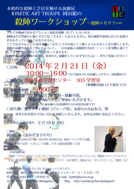 ËܳÊŪ¤Ê»¦¿Ø¤È¼Çµï¤òÌ¥¤»¤ë±é·à²°¡¡KINETIC ART TROUPE ²¬ÅÄÁȤǤϡ¢ »¦¿Ø¥ï¡¼¥¯¥·¥ç¥Ã¥×¤ò³«ºÅ¤·¤Æ¤ª¤ê¤Þ¤¹¡£ »¦¿Ø¤Ï¤¿¤À·¿Ä̤ê¤Ëư¤¯¤À¤±¤Ç¤Ï¡Ö¤Ç¤¤¿¡×¤È¤Ï¸À¤¨¤Þ¤»¤ó¡£ Ìò¤Î´¶¾ð¤ä¾õ¶·¤Ë±þ¤¸¤¿É½¸½ÎϤ¬¹ç¤ï¤µ¤Ã¤Æ¤¤¤Ê¤¯¤Æ¤Ï¤Ê¤ê¤Þ¤»¤ó¡£ ¤³¤³¤Ç¤Ï¤¤Á¤ó¤È¤·¤¿´ðËܤò¿È¤Ë¤Ä¤±¤¿¾å¤Ç¤½¤ÎÌò¤È¤·¤ÆÆ°¤¯¤è¤¦¤Ë¤Ê¤ë¤³¤È¤òÌÜɸ¤È¤·¤Þ¤¹¡£ »¦¿Ø¤Î´ðÁää½êºî¤òÃúÇ«¤Ë¥ì¥Ã¥¹¥ó¤·¡¢°ìÆü¤ÎºÇ¸å¤Ë¤Ï»¦¿Ø¤ò´Þ¤á¤¿1¥·¡¼¥ó¤ò¼ÂºÝ¤Ë±é¤¸¤Æ¤â¤é¤¦¤È¤¤¤¦¡¢½¼¼Â¤·¤¿ÆâÍÆ¤È¤Ê¤Ã¤Æ¤ª¤ê¤Þ¤¹¡£ »¦¿Ø¤ä¤ª¼Çµï¤Ë¶½Ì£¤Î¤¢¤ëÊý¡¢Ìò¼Ô¤ÎÊý¡¢±é·à¤ò¤·¤Æ¤¤¤ë³ØÀ¸¤ÎÊýetc¡Ä