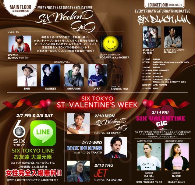 º£Ìë¡¢2/21(¶â)¤ÏËè½µËö¶âÅÚ½Ò¤Ù2000¿Í°Ê¾å¤òư°÷¤·Â³¤±¤Æ¤¤¤ëÏ»ËÜÌÚ¿ï°ì¤ÎBIG PARTY¡ØSIX WEEKEND GIG¡Ù º£Ìë¤Ï¤Ê¤ó¤È¥¹¥Ú¥·¥ã¥ë¥²¥¹¥È¤Ë³èư¤«¤é¤Ê¤ó¤È20¼þǯ¤ò·Þ¤¨¤¿TRF¤è¤ê DJ KOO¤ò·Þ¤¨¤Æ¤ªÆÏ¤±¤Ç¤¹¡ª ¤½¤·¤Æ¡¢SIX WEEKEND GIG¤Ç¤Ï½÷À¤Ë´ò¤·¤¤¥³¥ó¥Æ¥ó¥Ä¤âÀ¹¤ê¤À¤¯¤µ¤ó¡ª¡ª ¡ù¡ú¡ù¡ú¡ù¡ú¡ù¡ú¡ù¡ú¡ù¡ú¡ù¡ú¡ù¡ú¡ù¡ú¡ù¡ú¡ù¡ú¡ù¡ú¡ù Ëè½µËö¹±Îã¡õÏÃÂêʨÆÃ楱¡¼¥¡õ¥Õ¥ë¡¼¥Ä¥Õ¥ê¡¼¥Ó¥å¥Ã¥Õ¥§¡ª½÷À¤Ï¡¢¤Ê¤ó¤È̵ÎÁ¤Ç¿©¤ÙÊüÂꡪ ¥Õ¥ê¡¼¥Ó¥å¥Ã¥Õ¥§¤ÏËè½µ¶âÅÚ¤Î22:00-23:30¸ÂÄꡪ ¤ªÁá¤á¤Î¤´Íè¾ì¤ò¤ª´«¤á¤·¤Þ¤¹¡ª £²·î¤Î¥Õ¥ë¡¼¥Ä¤ÏS