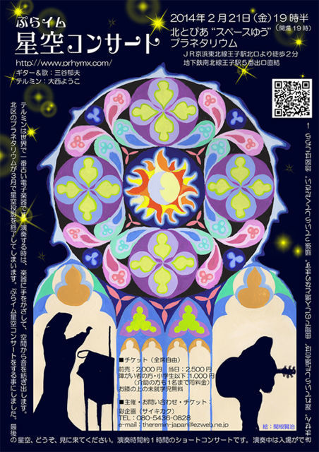 北区のプラネタリウムが、3月で星空投影を終了してしまうそうなので、 星空コンサートをする事にしました。 最後の星空、どうぞ、見に来てください☆ ■時:2014年2月21日(金)19時半開演(19時開場) ※演奏時間約1時間のショートコンサートです。 ※星空投影中は入場ができません。遅れていらした場合は、曲間で のご入場となりますので、なるべく開演までにご参集ください。 ■所:北とぴあ “スペースゆう” プラネタリウム 東京都北区王子1-11-1 北とぴあ6階 TEL:03-5390-1224 http://w