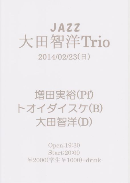 £²£³Æü¡ÊÆü¡ËÌëJazz ÂçÅÄÃÒÍÎTrio ÁýÅÄÈþ͵(Pf) ¥È¥ª¥¤¥À¥¤¥¹¥±(B) ÂçÅÄÃÒÍÎ(D) Open;19:30 Start;20:00 ¡ï2000(³ØÀ¸¡ï1000)+drink