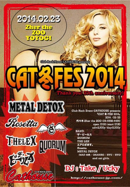 ★Club Rock Event CATHOUSE presents 「CAT冬FES 2014」★ 東京で活動するAEROSMITHのトリビュートバンド、「エアロざます。」ライブの告知をさせてください! イベント自体も、沢山の素晴らしいバンドと、DJタイムで終始ROCKな時間と空間を楽しめます! 是非遊びに来てください! 2014/02/23 @ 代々木Zher the ZOO (03-5358-4491) open 17:00/start 17:30 adv:2,500y/day:3,000y ◎DJ:Take/Ucky ◎BAND: ザ・ビールス QUORUM THE LEX エアロざます。 Rosetta METAL DETOX (MAD大内/OKAHIRO/RYU/RYO) チ