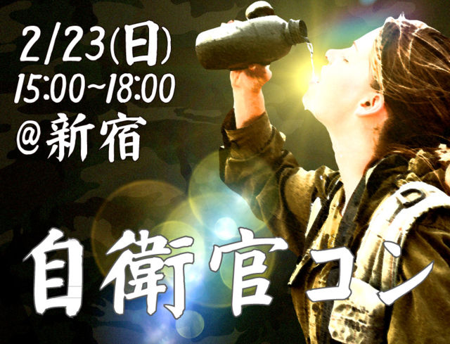 自衛官コン×新宿(2/23) 自衛官男性に朗報! ただいま、女性キャンセル待ち!! 女性キャンセル待ちなので大勢の方と知り合えるお勧めイベント☆ 更に、二名参加の場合はどちらか一名様が自衛官であればご参加頂けます! 楽しみ方はあなた次第!気軽に出逢ってみるのも良し興味があるからだけの参加ももちろんOK! 友達や飲み友を見つけるのも良し、恋人候補を見つけるでも良いんです! マッチング率の高いこの企画、皆さんのご参加お待ちしております! 詳しくはこちら☆ http://story-g.com/event/%e8%87%aa%e8%a1%9b%