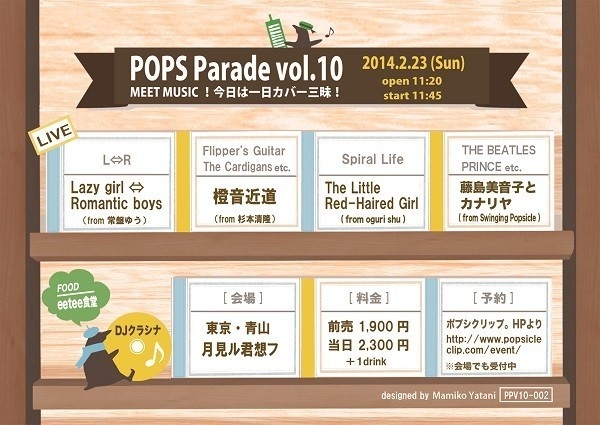 管理人様、ファンの皆様、告知失礼いたします。 ポップス・ギターポップリスナーに向けた音楽情報サイト「ポプシクリップ。(Popsicle Clip.)」は、10回目の主催イベントとなるPOPS Parade Vol.10を開催いたします。 豪華アーティスト陣が本イベント限りの特別バンドを編成し、渋谷系と呼ばれる邦楽や往年の良質な洋楽を中心とした楽曲を演奏する、スペシャルなカヴァーライブイベントです。 Swinging Popsicleの藤島さんは「藤島美音子とカナリヤ」名義でご出演、貴重な洋楽カヴァーを披露される予定です。 ファンの皆様のご来場をお待ちして