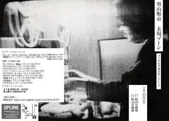 2月23日(日)渋谷のUPLINKで、 奥山順市の実験映画が特集上映されます。 フィルムヲ見ル会voL・3 奥山順市 未現ゾーン 17時20分開場、17時30分開映 ライブ・パフォーマンス:「わっか・being painted」ほか、 代表作の上映:「le cinema・映画」「まぜるな」ほか、 アフタートーク: 金子遊(映像作家、批評家)×奥山順市(実験映画作家) 詳細はこちら http://www.uplink.co.jp/event/2014/21757
