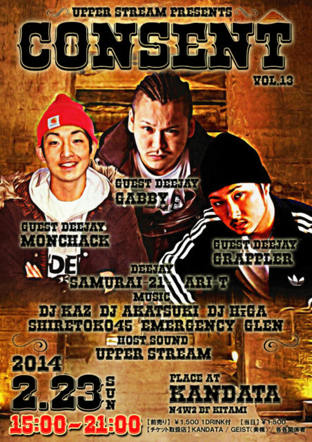 UPPER STREAM PRESENTS ★CONSENT vol.13★ 2014/2/23(sun) OPEN 15:00 - CLOSE 21:00 @ KANDATA 前売り \1500 w/1DRINK 当 日 \1500 - GUEST DEEJAY - GABBY MONCHACK GRAPPLER - DEEJAY - 侍-21- ARI-T - MUSIC - DJ KAZ DJ 暁 DJ HiGA SHIRETOKO 45 EMERGENCY GLEN - HOST SOUND - UPPER STREAM チケット取扱店 KANDATA/GEIST(美幌)/各関係者