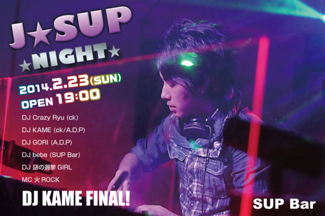 「2009年の10月17日(土)に行われた「me○a panic vol.4」において、当時所属していたGlitterのメンバーがDJとしてランダムに出演するG(Glitter)-TIMEと言う企画の1回目に出演し、DJとしてデビューを果たして以来、今日まで4年以上の長きに渡り、「ONE HUNDRED」、「BONZ Bar」、そして「SUP Bar」と場所を変えながらもDJをして来たDJ KAMEが今回のJ☆SUP NIGHTを持って、そのDJ活動に終止符を打つ事になりました。」 DJ KAME FINAL PLAY! 盛り上がって行きたいと思います! 【J☆SUP NIGHT vol.17@SUP Bar】 ■日時 2014年2月23日(日