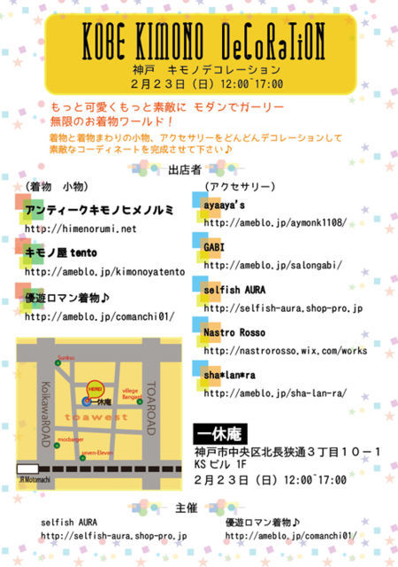 神戸で新しいイベントを開催します。 神戸キモノデコレーション♪ 2月23日(日) 12:00〜17:00 場所 茶の湯サロン 一休庵 http://loco.yahoo.co.jp/place/5d1a30734fea623593451083f3db1d45cbb7fcfc/ ※こちらへのお問い合わせはご遠慮願います。 神戸元町で人気の着物屋さん&今をときめくアクセサリー作家さんが 集結して素敵な着物イベントを開催します! モダンでガーリーなお着物や小物・アクセサリーを コーディネートしながら楽しくお買い物ができるイベントですので ぜひご来店お待ちしております♪