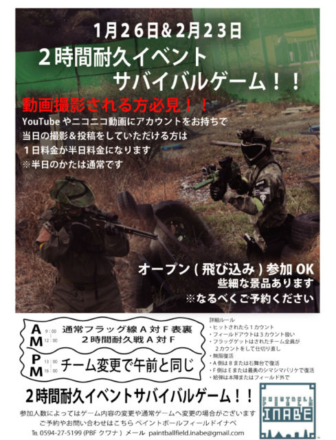 管理人様 続けて2月分も告知させていただきます。 2月のイベントも1月に引き続き、耐久戦となります。 お気軽にご参加ください。 飛び込み参加OKですが、なるべくご予約をお願い致します。 詳細は http://pbf-inabe.jimdo.com/?logout=1 まで!! 宜しくお願い致します。