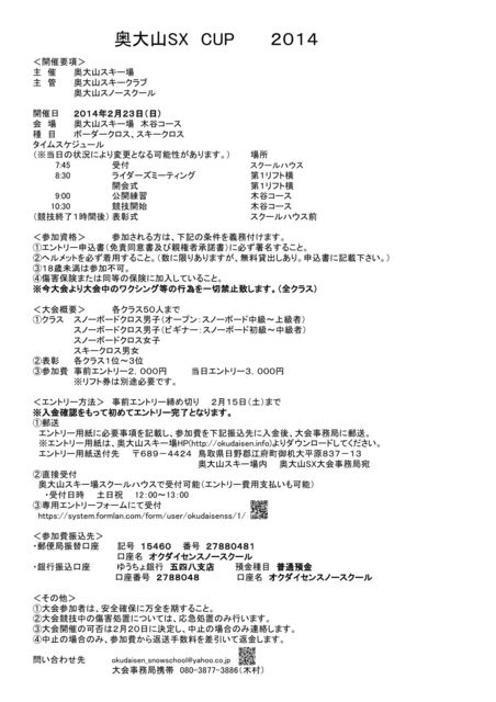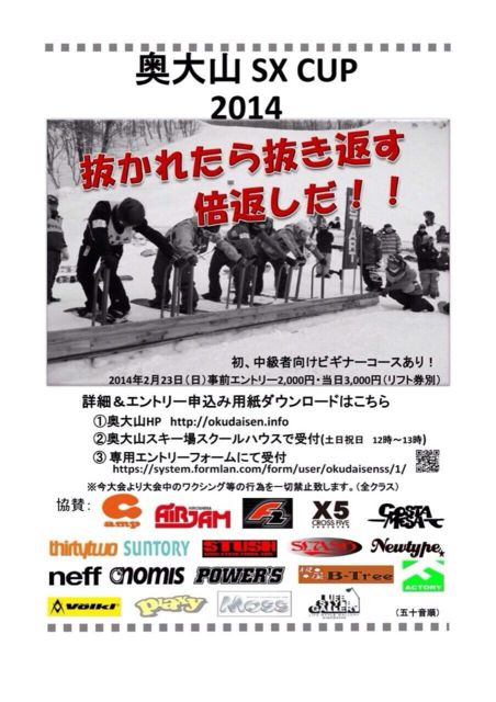 2月23日(日)に今年も開催されるスキー&スノーボードクロス大会です。 すでにエントリー募集が始まっています。 事前エントリー2,000円 当日エントリー3,000円 ※リフト券は別途必要です。 事前エントリーの締め切りは2月15日ですので遅れないように。 申し込み用紙、要項はスキー場HP http://okudaisen.info からダウンロードできる他、 協賛各ショップ店頭でも入手できます。 また、今年から便利なメールフォームでのエントリーが可能になりました。 下記URLに必要事項を入力するだけでなので便利です。