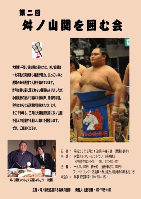 管理人様、イベント告知でお世話になります。 2月24日(月)、もう来週になるのですが、兵庫県伊丹市で第2回「舛ノ山関を囲む会」が開催されます。 舛ノ山関を応援して下さる方であればどなたでも参加できます。 但し、会場の都合上、予約人数により締め切る場合がございます。悪しからずご了承願います。 以下は詳細です。 日時:平成26年2月24日(月)午後7時〜(約2時間) 会場:白雪ブルワリーレストラン「長寿蔵」 伊丹市中央3-4-15 TEL 072-773-1111 会費:一人10,000円 要予約 (当日申込12,000円) フリ