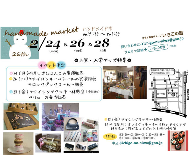 寒い〜毎日ですが、そろそろ新学期、新入学の準備をはじめませんか。この時期が一番揃います。 毎回大人気のマスクをはじめ、お菓子でおなじみのfikaの体にやさしい お弁当販売や今人気のアイシングクッキーを気軽に体験できるイベントを用意しています。 あたたかくしてお越しください(*^_^*) 2/24(月)・26(水)・28(金)いずれも9時30分〜13時まで 場所→伊丹市御願塚2丁目いちごの庭(地図あり) お問い合わせはichigo-no-niwa@goo.jpまで イベント内容★ 24(月)★消しゴムはん