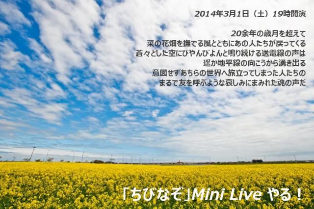 ¥¹¥Ú¡¼¥¹¤ª¼Ú¤ê¤¤¤¿¤·¤Þ¤¹¡£ 2014ǯ3·î1Æü¡¡Ì¾¸Å²°»ÔÀé¼ï¶èº£ÃÓ¡Ö·î¤È¥é¥¤¥ª¥ó¡×¤Ë¤Æ¡Ö¤Á¤Ó¤Ê¤¾¡×Mini Live ¤ò¹Ô¤¤¤Þ¤¹¡£ 2012ǯ12·î¤ÎÉü³è¥é¥¤¥Ö¤Ï²áµî¤Î¡Ö¤Ê¤¾¾¦¡×¤ò¤ª¤µ¤é¤¤¤·¤¿·Á¤Ç¤·¤¿¤¬¡¢ º£²ó¤Ï¼ñ¸þ¤òÊѤ¨¤Æ¡¢²áµî¤Î¡Ö¤Ê¤¾¾¦¡×¤È¤Ï°Û¤Ê¤Ã¤¿Â¦Ì̤ò¤ª¸«¤»¤Ç¤¤ë¤È»×¤¤¤Þ¤¹¡£ ÊѸ¸¼«ºß¡¢ÀéÊÑËü²½¡¢Â¹øÉÔ¼«Í³¡¢Æ¬Ç¾ÉÔÌÀÚò¤Ê¡Ö¤Ê¤¾¾¦¡×¤ò¤ª³Ú¤·¤ß¤¯¤À¤µ¤¤¡£ ¾ÜºÙ¤Ï¤³¤Î¥¤¥Ù¥ó¥È¥Ú¡¼¥¸¤Ë¿ï»þ½ñ¤²Ã¤¨¤Æ¤¤¤¤Þ¤¹¤Î¤Ç¤ª¸«Æ¨¤·¤Ê¤¯¡ª ¡Ì´ðËÜ»²²Ã¥á¥ó¥Ð¡¼¡Í ¡¡»ç¶¸Í𡡣ǡ¥£Ö£ï ¡¡¤«¤Þ¤¤¤¿¤ÁºÍ¢¡¡£Ç¡¥£Ö£ï ¡¡»°ÅÓ¤ÎÆùË¡»Õ¡¡£Â¡¥£Ö£ï