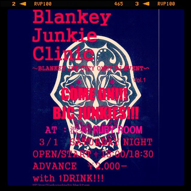 ´ÉÍý¿ÍÍÍ¡¢¹ðÃΤµ¤»¤Æ²¼¤µ¤¤¡ª ³§ÍÍ¡¢ Blankey Junkie Clinic¤Î¥Õ¥¡¡¼¥¹¥È¥¤¥Ù¥ó¥È¤¬·èÄꤷ¤Þ¤·¤¿¡ª¡ª ¥Õ¥¥¡¼¥Ã¥Õ¥¥¡¼¡ù¡¡Á´¤Æ¤Î½àÈ÷¤ÏÀ°¤Ã¤¿¤¼¡¼¡ª¡ª À§Èó¤È¤â¡¢¥í¥ó¥°¥Ø¥¢¡¼¿¶¤êÍ𤷤ƹø¤ò¤¯¤Í¤é¤»¤Ê¤¬¤é ¥¹¥í¡¼¥Ê¥ó¥Ð¡¼½Å¶ì¤·¤¯¡¡Ä«¤Þ¤Ç³¤¯¥Ñ¡¼¥Æ¥£¡¼¤Ë¤´»²²Ã²¼¤µ¤¤¡Ä¡£ À褺¤Ï¡¢ÆüÄø¡¢¾ì½ê¤ò¹ðÃΤµ¤»¤ÆÄº¤¤Þ¤¹¡£ ¡ÊÄɤäơ¢¤è¤ê¾Ü¤·¤¯¥¤¥Ù¥ó¥ÈÆâÍÆ¤ò¾Ò²ð¤·¤Æ¤¤¤¤Þ¤¹¡£¡Ë ¡úBLANKEY JUNKIE CLINIC¡¡vol.1¡ú¡ÁBLANKEY JET CITY DJ ¥¤¥Ù¥ó¥È¡Á ¡üÆüÄø:3·î1Æü(ÅÚ) ¡ü»þ´Ö¡§18:00OPEN¡Á23:00CLOSE ¡ü¾ì½ê:½ÂëRUBY ROOM
