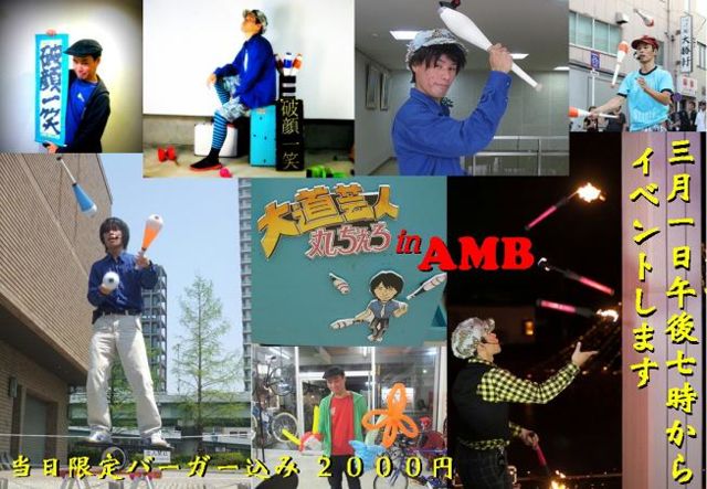 本物の味を追求するハンバーガーショップ「AUNTY-MEE BURGER(アンティーミーバーガー)」に、 滋賀県を代表する大道芸人の「丸ちぇろ」がやって来る! バーガーに舌鼓を打ちながら、目の前で繰り広げられるプロのジャグリングに拍手を! 日時 2014年3月1日午後7時〜 入場料 2000円(限定バーガー付き)