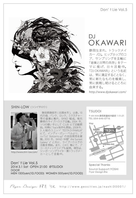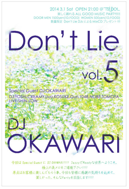 on't Lie vo.5 2014 3.1 Sat OPEN 21:00 @TSUDOI ³Ú¤·¤¯ÍÙ¤ì¤ëALL GOOD MUGIC PARTY!!!! DOOR MEN 1500yen(1D,FOOD) WOMEN 500yen(1D,FOOD) ¿ôÎ̸ÂÄê Don't Lie DJs ¤Ë¤è¤ë Mix CD ¥×¥ì¥¼¥ó¥È!!!! Special Guest DJ:OKAWARI http://www.djokawari.com/ DJ:YOSHI,CREAMY,Uuu,KOSUKE,1048,Guri,NOBE,TOMOYA LIVE:SHIN-LOW º£²ó¤ÏSpecial Guest¤ËDJ OKAWARI !!!! Jazzy¤ÇMoody¤ÊÀ¤³¦¤Ø¤è¤¦¤³¤½¡£ ¶Ë¾å¤ÎÈþ¥á¥í¤ò¤´´®Ç½²¼¤µ¤¤!!!! ¸¶ÅÀ¤Ï¤ªµÒÍͤ˳ڤ·¤ó¤Ç¤â¤é¤¦»ö¡£ º£²ó¤â³§Íͤ˴¶¼Õ¤Îµ¤»ý¤Á¤ò¹þ¤á¤Æ¡¢ ³Ú¤·¤«¤Ã¤¿¡¢¤½¤ó¤ÊParty¤ò