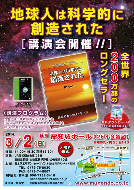 人類の起源の真実に迫る、衝撃の書! 「地球人は科学的に創造された」講演会開催! カナダの生物の教科書にも掲載されました 科学的生命創造論をご紹介いたします。 無料でご参加頂けます。 皆様のご参加をお待ちしております。 日時:3月2日(日) 開場13:30 開演14:00 終演16:30 場所:高知城ホール 2F・小会議室 〒780-0850 高知県高知市丸ノ内2丁目1-10 http://www.kochijyohall.jp/ 交 通:JR高知駅から〜車で5分 高知城前駅(土佐電鉄伊野線)から〜徒歩10分 地図リンク http:/