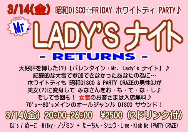 3/14(¶â) ¾¼ÏÂDISCO¡ùFRIDAY ¥Û¥ï¥¤¥È¥Ç¥£ PARTY¢ö ¡ÚMr. LADY'S ¥Ê¥¤¥È - RETURNS -¡Û Â繥ɾ¤òÇ¤¿(?)¡Ú¥Ð¥ì¥ó¥¿¥¤¥ó¡¦Mr. Lady's ¥Ê¥¤¥È¡Û¢ö µÏ¿Åª¤ÊÂçÀã¤Ç»²²Ã¤Ç¤¤Ê¤«¤Ã¤¿¤¢¤Ê¤¿¤Î°Ù¤Ë¡Ä ¥Û¥ï¥¤¥È¥Ç¥£¤â ¾¼ÏÂDISCO & PARTY CRAZE¤ÎÃËÀDJ¤¬ Èþ½÷(?)¤ËÊѿȤ·¤Æ ¤ß¤Ê¤µ¤ó¤ò¤ª¡¦¤â¡¦¤Æ¡¦¤Ê¡¦¤·¢ö ¤½¤·¤Æº£²ó¤â¡ª ½÷Áõ¤Î¤ªµÒ¤µ¤Þ¤ÏÆþŹ̵ÎÁ¢ö 70's¡Á80's¥á¥¤¥ó¤Î¥ª¡¼¥ë¥¸¥ã¥ó¥ë DISCO ¥µ¥¦¥ó¥É¡ª 3/14(¶â) 20:00-26:00 \2500 (2¥É¥ê¥ó¥¯ÉÕ) DJ's / ¤á¡¼¤³¡¦Milky¡¦¥Î¥¾¥ß¥ó ¡Ü ¤¿¡¼¤Á¤ó¡¦¥·¥å¥¦¡¦Lime¡¦Kick Me (PARTY CRAZE)