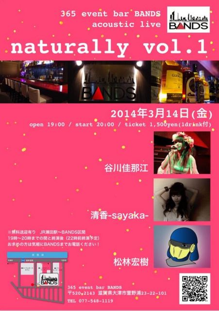 @365 event bar BANDS (滋賀/瀬田) 『naturally vo.1』 w:谷川佳奈江 / 清香-sayaka- / 松林宏樹 OPEN 19:00 / START 20:00 CHARGE ¥1,500 (1drink付) ★会場website★ http://365eventbarbands.com/ ★会場アクセス(最寄駅)★ JR琵琶湖線「瀬田」駅より車。 〒520-2143 滋賀県大津市萱野浦23-22-101 TEL:077-548-1119