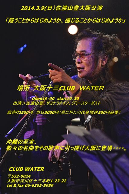 £³·î£·Æü¡Ê¶â¡Ë Âçºå»ÔÀ¾À®¡¡ÆñÇȲ° http://tabelog.com/osaka/A2704/A270406/27046610/dtlrvwlst/1822393/ ³«±é¡§19:00 ÅꤲÁ¬ ½»½ê¡§ÂçºåÉÜÂçºå»ÔÀ¾À®¶èÇëÇ·Ãã²°2-5-2 £³·î£¸Æü¡ÊÅÚ¡Ë Âçºå¹¾ºä¡¡²»²°·Êµ¤²° http://music.otoyakeikiya.com/index.php?p=guest/top ³«¾ì¡§18¡§00¡¡³«±é¡§19:00 ÎÁ¶â¡§Í½Ìó3000±ß/ÅöÆü3500±ß¡Ê°û¿©ÊÌ¡Ë ½»½ê¡§ÂçºåÉÜ¿áÅĻԹ¾¤ÎÌÚÄ®14-23 ÅÅÏá§06-6339-1121 £³·î£¹Æü¡ÊÆü¡Ë Âçºå½½»°¡¡¥¯¥é¥Ö¥¦¥©¡¼¥¿¡¼ http://www4.ocn.ne.jp/~c.water/ ¡Øµ¿¤¦¤³¤È¤«¤é¤Ï¤¸¤á¤è¤¦¤«¡¢ ¿®¤¸¤ë¤³¤È¤«¤é¤Ï¤¸¤á¤è¤¦¤«¡Ù