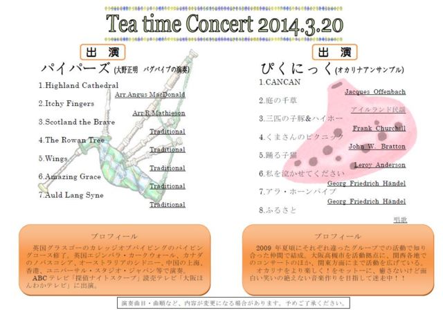 オカリナアンサンブル「ぴくにっく」が 文化パルク城陽で演奏します。 会場のふれあいホールは、 円形の半地下エントランスホールに なっています。 吹き抜けになっているので、おそらく 音もよく響きそうです。 今回は、ぴくにっく・フォーマルな服装で演奏します。 ピンクネクタイ&ピンクスカーフで(^o^)丿 楽しいオカリナの演奏、ぜひ聴きにきてください 日時 平成26年3月20日(木) 午後3時〜3時半 (2時半〜3時までは、バグパイプの方が演奏されます) 場所 文化パルク城陽 ふれあいホール 京