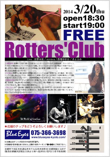 ★3月20日(木) Rotters' Club open18:30/start19:00/fee:free (Chip制) Live:吉野永祐 / sionsiva / 西堀ゆきお / きよふみ ♪吉野永祐 京都こよなく愛してやまないシンガーソングライター吉野永祐。アコースティックギターの弾き語りとバンドでもライブ活動。オリジナルからカバーまで幅広く手掛けており、親しみやすい歌詞と哀愁漂うサウンドが特徴。古い音楽に影響されたせいか、どこか懐かしさを感じさせる楽曲になっている。 ♪sionsiva 情景や心象を独特の世界観を持ったシンプルな曲で表現する。ゆれ動き、深く沈む、こころの襞