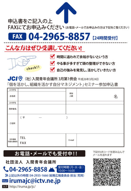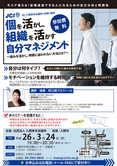 管理人様、皆様こんにちは 書き込みさせていただきありがとうございます。 所属しております (社)入間青年会議所が主催させていただきますセミナーのご案内です。 「1人1人が輝き、組織も輝く」研修をと考えての実施です。 ぜひ、もっと輝きたい という方、3月のセミナーでお待ちしております。 どなたでもご参加いただけます 『個を活かし、組織を活かす自分マネジメント』 〜強みを活かし、時間に追われない方法とは〜 自分の強みを知っていますか? その力を組織で活かすことが出来ていますか?