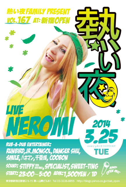 熱い夜 vol.167 at.新宿OPEN 2014.3.25(火) ◆Guest Entertainer◆ NEROMI ◆Rub-A-Dub Entertainer◆ RUNBIRD Jr.MONGOL Danger Shu SMILE バネマン 千亜輝 COOBON and Open Mic ◆Sound◆ STIFFY from.BOTH WINGS SPECIALIST Sweet-Ting ▼START▼ 23:00〜5:00 ▼ADM▼ 1.500yen/1d ▼会場▼ 東京都新宿区新宿2-5-15 第一山興ビルB1 Tel 03-3226-8855 http://blogs.yahoo.co.jp/club_open 【熱い夜】mixi.community http://m.mixi.jp/view_community.pl?guid=ON&id=3113006
