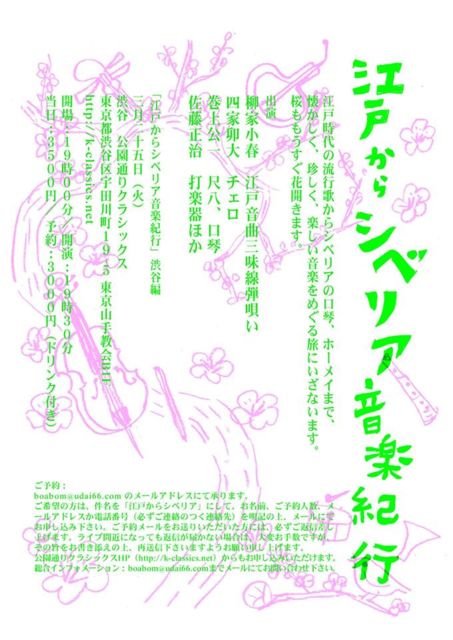 江戸時代の流行歌からシベリアの口琴、ホーメイまで、 懐かしく、珍しく、楽しい音楽をめぐる旅にいざないます。 桜ももうすぐ花開きます。 3月25日(火) 渋谷 公園通りクラシックス 東京都渋谷区宇田川町19-5 東京山手教会B1F http://k-classics.net/ 開場:19時00分/ 開演:19時30分 当日:3,500円/ 予約:3,000円(ドリンク付き) 出演 柳家小春 /江戸音曲三味線弾唄い 四家卯大 /チェロ 巻上公一 /尺八、口琴 佐藤正治 /打楽器ほか ご予約: boabom@uda