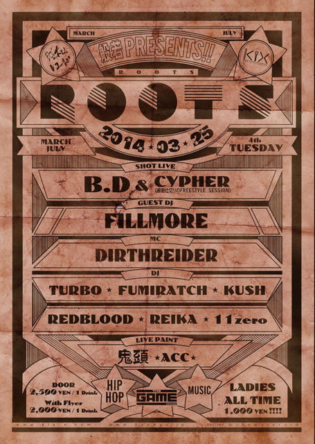 2014.03.25(火) -般若presents-「ROOTS」 DOOR 2500/1D W/F 2000/1D ★LADIES ALL TIME¥1000!! エントランスで「ヨーク」のGUESTでJBCでDISCOUNT! ご利用ください。 会場 渋谷THE GAME http://www.shibuyathegame.com ★GUEST DJ FILLMORE ★SHOT LIVE B.D &CYPHER(般若仕切りのFREESTYLE SESSION) ★DJ TURBO / FUMIRATCH / KUSH / REDBLOOD / REIKA / 11zero ★LIVE PAINT 鬼頭(ACC) ★MC DARTHREIDER