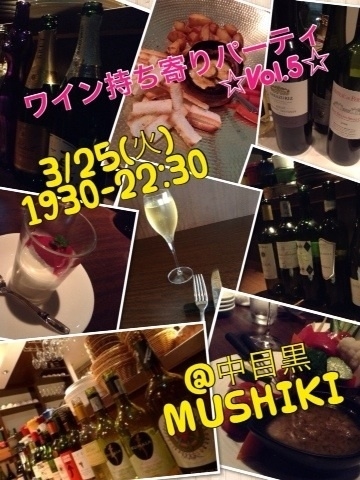 毎回、たくさんの美味しいワインとの出会いがある持ち寄りパーティーも… 皆さんのおかげで今回で5回目☆ リピーターも続々増えてます☆ さて、、、 今回は、まだオープン間もない素敵なダイニングで開催((* ´艸`)) 桜が咲き始めた目黒川を見ながら向かうお店までの道程☆ 中目黒駅より徒歩5分のお店☆ MUSHIKI〜Cafe Bar Dining〜 http://tabelog.com/tokyo/A1317/A131701/13165254/ 1度に10数種類以上のワインを味わえる機会なんてそうないですよね☆(≧∀≦*)ノ 街場のお店でも赤白3種類ずつくらいがいいところ。。。 必要なも