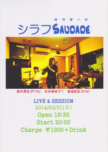 £³£±Æü¡Ê·î¡ËBrazil ¥·¥é¥ÕSaudade ¥é¥¤¥Ö¡õ¥»¥Ã¥·¥ç¥ó ÈijÀÉð»Ö(Vo/G) ÎëÌÚ¸ü»Ö(Vo/Pf) Àа湬»Þ(Fl) Open 19:30 Start 20:00 ¡ï1000+drink