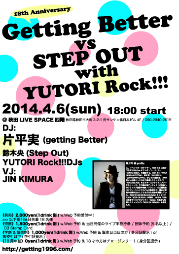 東京、下北沢を中心に18年続くロックパーティの主催DJであり、Rock in Japan Festival, CountDown Japan Festivalでもお馴染みの片平実(Getting Better)氏を招き、今回はGettingBetter18周年記念ツアーとして秋田のロックイベント、STEP OUTとYUTORI Rock!!!が共演!