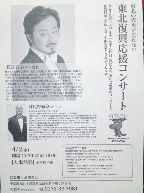 ¡ÖÅìË̤ο̺Ҥò˺¤ì¤Ê¤¤¡¡ÅìËÌÉü¶½±þ±ç¥³¥ó¥µ¡¼¥È¡× À¤³¦¤Ç¤¿¤À°ì¿Í¤È¸À¤ï¤ì¤ë¥ª¥Ú¥é²Î¼ê¡¦¥ª¥Æ¥é²Î¼ê¡ÊÁÎη¡Ë²Ö·î¿¿¡¢¥Ô¥¢¥Ë¥¹¥ÈÆüÈæÌîÉÒɧ¤Ë¤è¤ëÊ©¶µ»¾²Î¡Öǰʩ¡×¤òÃæ¿´¤Ë¹ñÆâ¡¢³¤³°¤Î̾¶Ê¤ò¿¥¤ê¸ò¤¼¤¿¾Ð¤¤¤È´¶Æ°¤Î¥È¡¼¥¯¥·¥ç¡¼¡£¤½¤ì¤¬¡Æ¡ÆÇ°Ê©¥³¥ó¥µ¡¼¥È¡É¤Ç¤¹¡£ ´û¤Ë¿¤¯¤Î²ñ¾ì¤Ç³«ºÅ¤µ¤ì¡¢Â繥ɾ¤òÇ¤¿Ç°Ê©¥³¥ó¥µ¡¼¥È¤¬ÀÄ¿¹¸©¤Ï¹°Á°»Ô¤Ç³«ºÅ¤¤¤¿¤·¤Þ¤¹¡£ ²ñ¾ì¡§¾ôÅÚ¿¿½¡ÂçëÇÉ¡¡ÌÀ¶µ»û¡ÊÀÄ¿¹¸©¹°Á°»Ô¿·»ûÄ®157ÈÖÃÏ¡Ë ³«¾ì¡§17:30 ³«±é¡§18:00 Æþ¾ìÎÁ¤Ï̵ÎÁ¤È¤Ê¤Ã¤Æ¤ª¤ê¤Þ¤¹¡£ Ê©¶µ»¾²Î¤òÀ¸¤Çʹ¤±¤ë¤Þ¤¿¤È¤Ê¤¤µ¡²ñ¤Ç¤¹¤Î¤Ç³§