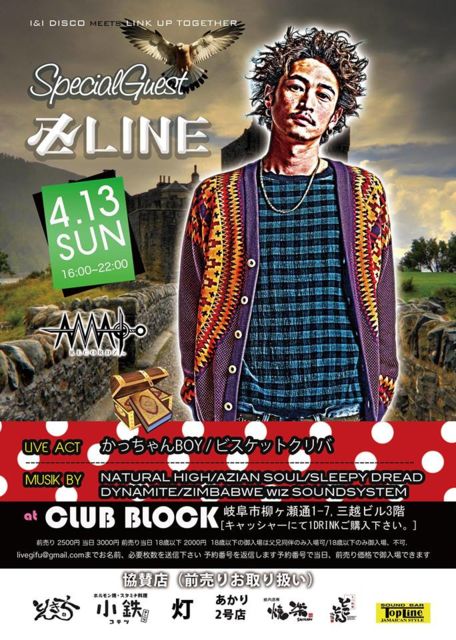 I&Idisco meets LINK-UP-TOGETHER LIVEin´ôÉìÒÄLINE ÆüÄø 4/13(Æü) ²ñ¾ì [´ôÉ츩´ôÉì»Ô] BLOCK (´ôÉì»ÔÌø¥öúóÄÌ1-7 »°±Û¥Ó¥ë3³¬) ¥¤¥Ù¥ó¥È̾ ¢£Special Guest Live¢äÒÄLINE ¢£Deejay¢ä ¥Ó¥¹¥±¥Ã¥È¥¯¥ê¥Ð / ¤«¤Ã¤Á¤ã¤óBOY ¢£Sound¢ä NATURAL HIGH / SLEEPY DREAD / ASIAN SOUL / DYNAMITE / ZIMBABWE¡¡ ¢£SOUND SYSTEM¢ä top564 »þ´Ö 4pm-10pm ÎÁ¶â Á°Çä\2500 Á°Çä¡¢ÅöÆü 18ºÐ°Ê²¼ \2000 ÅöÆü\3000 18ºÐ°Ê²¼ É㷻Ʊȼ¤Î¤ßÆþ¾ì²Ä ¡Ö¥É¥ê¥ó¥¯ÂåÊÌÅÓÍ×(\500)¡× ¥Á¥±¥Ã¥È¼è¤ê°·¤¤ ¥á¡¼¥ëͽÌó gifelive@gmail.com Ëø¡¢¤ªÌ¾Á°¤È