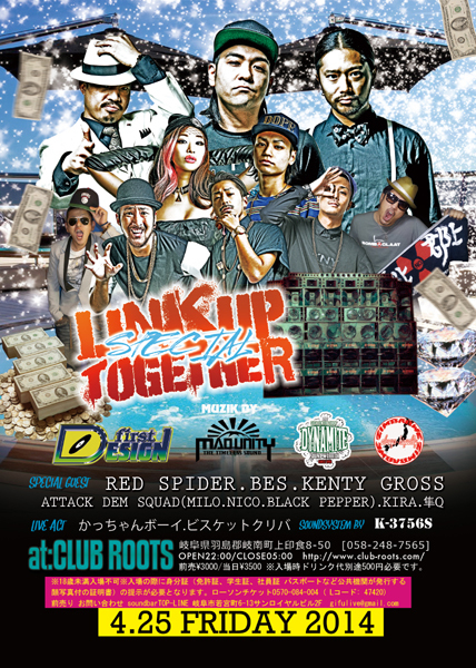 LINK-UP-TOGETHER SPECIAL 4·î25Æü(¶â) ´ôÉ츩 @CLUB ROOTS (´ôÉ츩±©Åç·´´ôÆîÄ®¾å°õ¿©8-50 TEL : 058-248-7565) OPEN 22:00 (½Ð±é) RED SPIDER/KENTY GROSS/BES KIRA/È»Q/ATTACKDEM SQUAD FIRST DESIGN/DYNAMITE/MAD UNITY/ZIMBABWE ¤«¤Ã¤Á¤ã¤ó¥Ü¡¼¥¤/¥Ó¥¹¥±¥Ã¥È¥¯¥ê¥Ð SOUND SYSTEM by K-3756S Á°Çä 3000±ß ÅöÆü 3500±ß ¢¨¥É¥ê¥ó¥¯ÂåÊÌÅÓ500±ßɬÍפǤ¹¡£ ¢¨18ºÐ̤ËþÆþ¾ìÉÔ²Ä ¢¨Æþ¾ì¤ÎºÝ¤Ë¿Èʬ¾Ú¡ÊÌȵö¾Ú¡¢³ØÀ¸¾Ú¡¢¼Ò°÷¾Ú ¥Ñ¥¹¥Ý¡¼¥È¤Ê¤É¸ø¶¦µ¡´Ø¤¬È¯¹Ô¤¹¤ë´é¼Ì¿¿ÉդξÚÌÀ½ñ¡Ë¤ÎÄ󼨤¬É¬ÍפȤʤê¤Þ¤¹¡£ ¢£TICKET INFO¢£