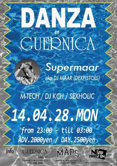 来週の月曜日!(祝日前)ゲルニカでイベントをする事になりました♫ ゲストはNew Mix CD 『LESSON.08 ”TOKYO CULT”』が先日発売されたばかりのDEXPISTOLSからSupermaar aka DJ MAARが初のソロで来広! 会場も昨年夏の泡パーティ”Espuma”も記憶に新しい Guernica Nishio で行います^^/ いつものクラブとは少し違った雰囲気でオシャレして一緒に楽しみましょーー♫ ”DANZA en Guernica” 4/28(月) at Guernica Open/23:00 Guest : Supermaar aka DJ MAAR(DEXPISTOLS) DJ: M-TECH / SEXHOLIC / KCH チケット ADV.