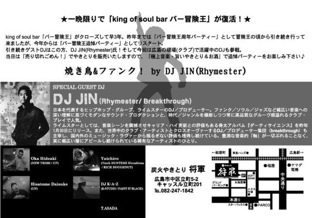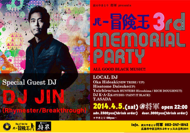 DJ JIN氏を迎えての年に1回の最強グルーヴパーティー! 今年は4月5日(土)に決まりました! 前売チケットを将軍にて販売中☆ 将軍に寄れない方はメッセージでチケット取り置きいたしますので「4月5日の件」との表題で下記に私にメッセージお願いします。 .. 【バー冒険王 3rd MEMORIAL PARTY】 Special Guest DJ : DJ JIN(RHYMESTER / Breakthrough) 日時 : 4月5日(土) 22:00〜 場所 : 炭火やきとり 将軍 082-247-1842 料金 : 前売り 2500円(1drink order) 当日 3000円(1drink order) やきとり 150円〜 DJ