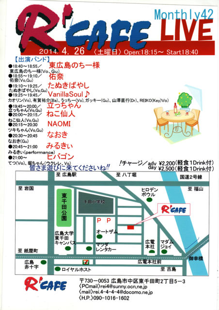 お世話になります!!!ボカニコ×ボカラボありがとうございました!!! 4月ですね!! ボカロフもとうとう4周年達成しました!!!!! 今年度に広島にやってきたという方!休みのシフトが変わって土曜日がひまっだ!という方 ボカロフで一緒に歌って騒ぎませんか? 今回は、連日イベントもありのんびり【中規模開催】です!! 5月は盛大に開催しようと思っております! 今年度も何卒よろしくお願いいたします! 【開催日程】 2014年4月19日(sat) 【場所】 ビリー・ザ・キッド流川店 広島市中区流川町5−17 http://local.